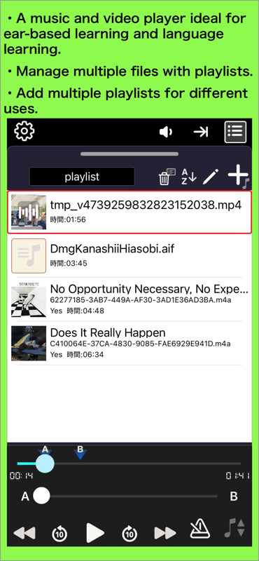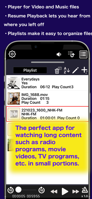 A video and music file player with a resume function that allows playback to continue from the previous playback position.