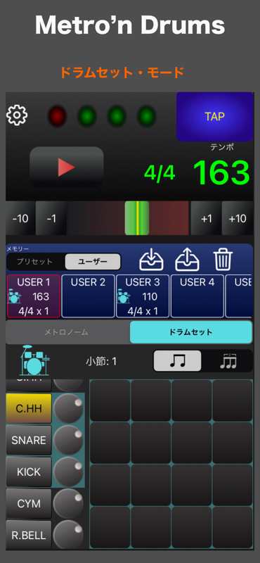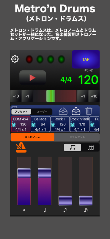 メトロノームとドラムセットが一緒になった、音楽練習用メトロノーム・アプリケーション