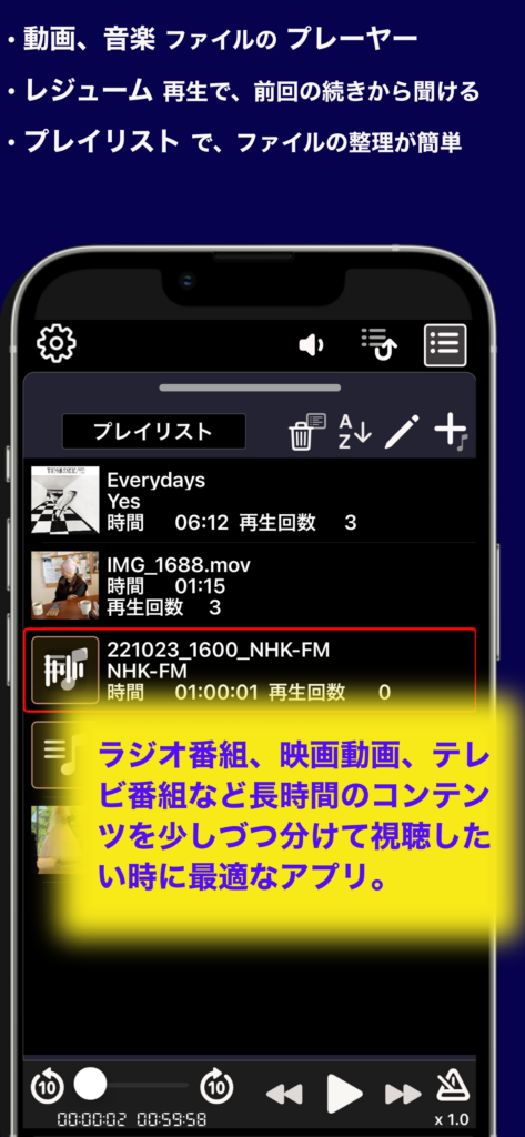 前回の再生位置から続けて再生を行うレジューム機能を持った、動画、音楽ファイルのプレーヤー。
