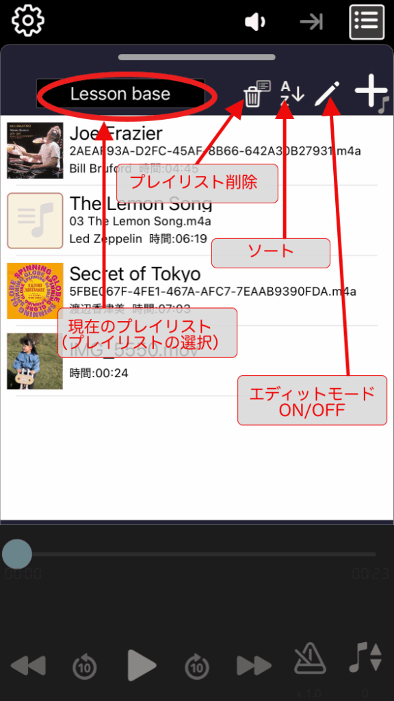 - タップすると全てのプレイリストが表示され、プレイリストの選択ができます。