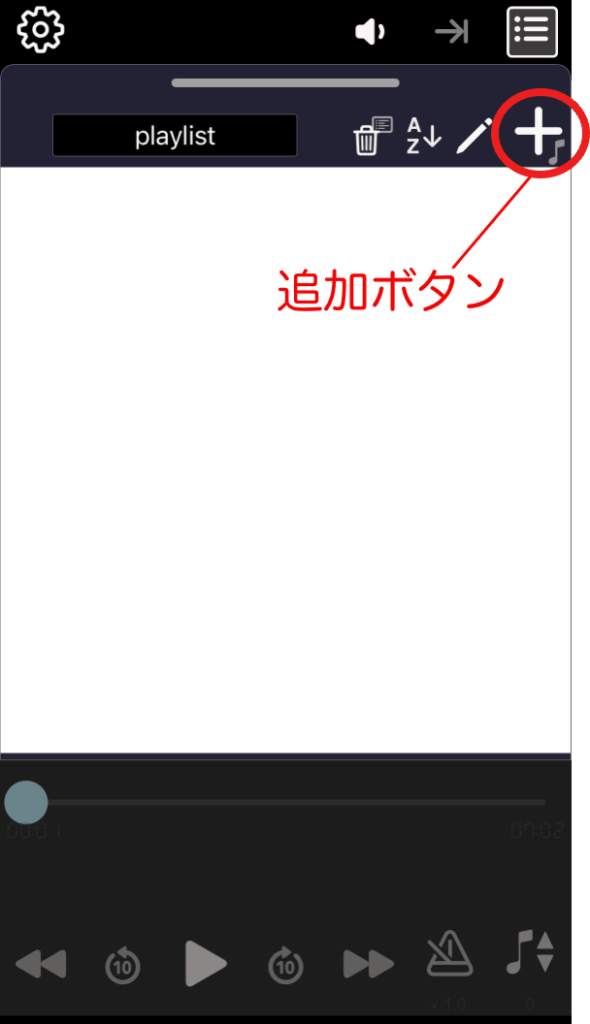 まず、「追加ボタン」でプレイリストに再生メディア(音楽ファイルまたは動画)を登録しましょう。