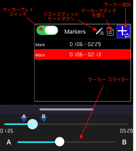 マーカーとは、特定の再生位置を記憶したもので、選択するとその位置から再生されます。また再生終点も指定することで、ループ再生(ABループ再生)が可能です。