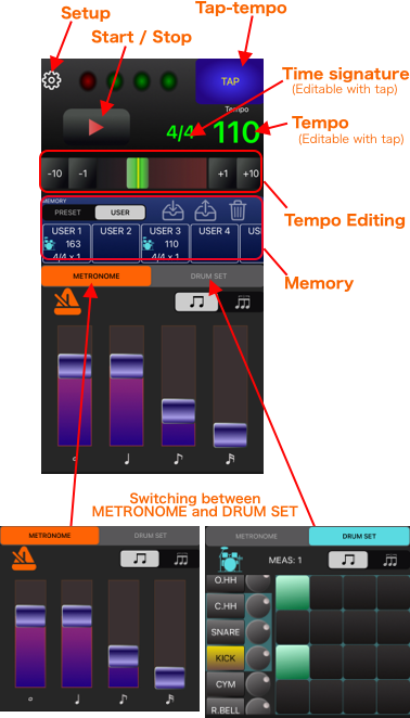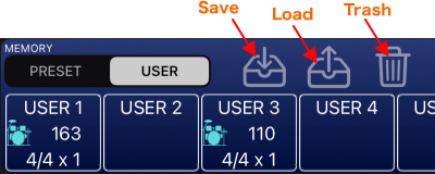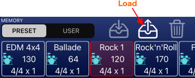 There are two types of memory: “Preset,” which stores simple rhythm patterns, and “User,” which stores rhythm patterns and metronomes you create yourself.