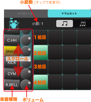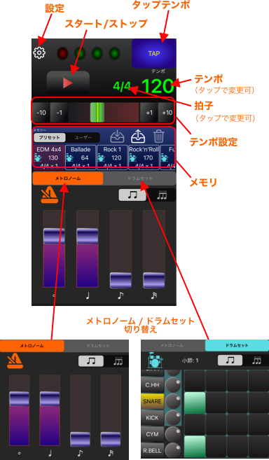 - メトロノームとドラムセットがボタンひとつで切り替わります。
