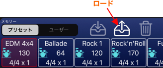 プリセットメモリーには、あらかじめシンプルなリズムパターンが登録されており、ロードすることが可能です。