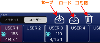 作成したリズムパターン、メトロノームは、ユーザーメモリーに保存することができます。