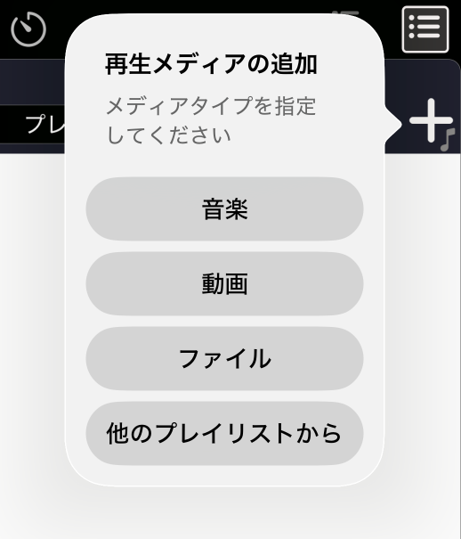リストに再生メディア(動画またはオーディオファイル)を登録します。「追加ボタン」をタップすると次のようなメニューが現れます。
