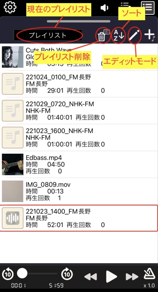 プレイリストに再生メディアを追加していくとこのようなリストになります。動画と音楽ファイルを同じプレイリストに並べることも可能です。