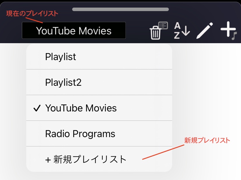 • リストの一番下の「+新規プレイリスト」をタップすると、新たなプレイリストが作られます。